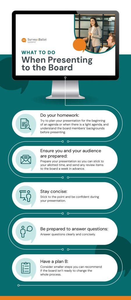 Know how much time you’ll have to present and stick to the amount of time allotted. If you have items you’d like the board to review ahead of time, send them a week in advance so they have time to look everything over. - Stick to the point