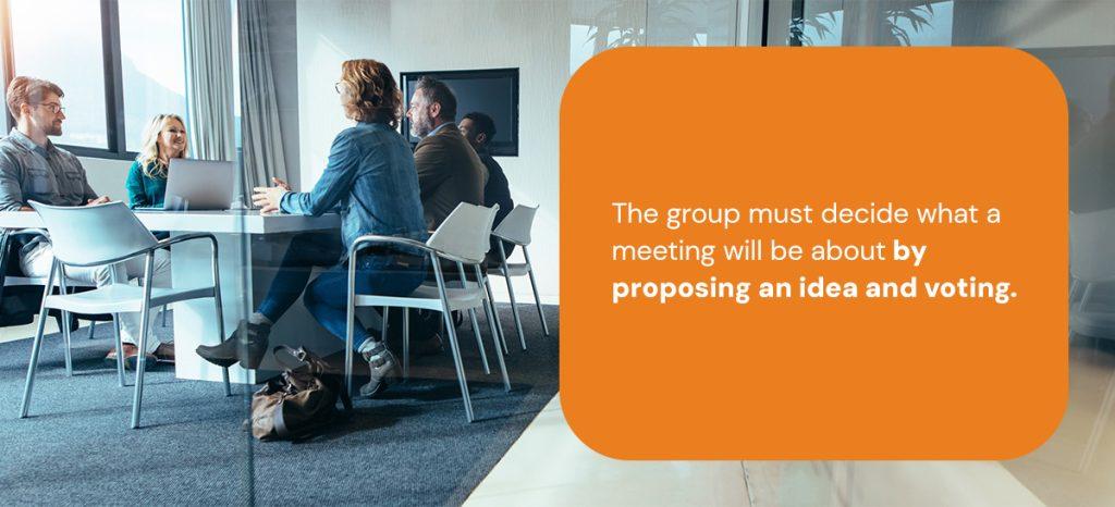 To further support the idea that each item receives full debate, your team must only evaluate one idea at a time. The group must decide what a meeting will be about by proposing an idea and voting. If at least one other person agrees to the proposal, participants can discuss the topic while adhering to the other rules.