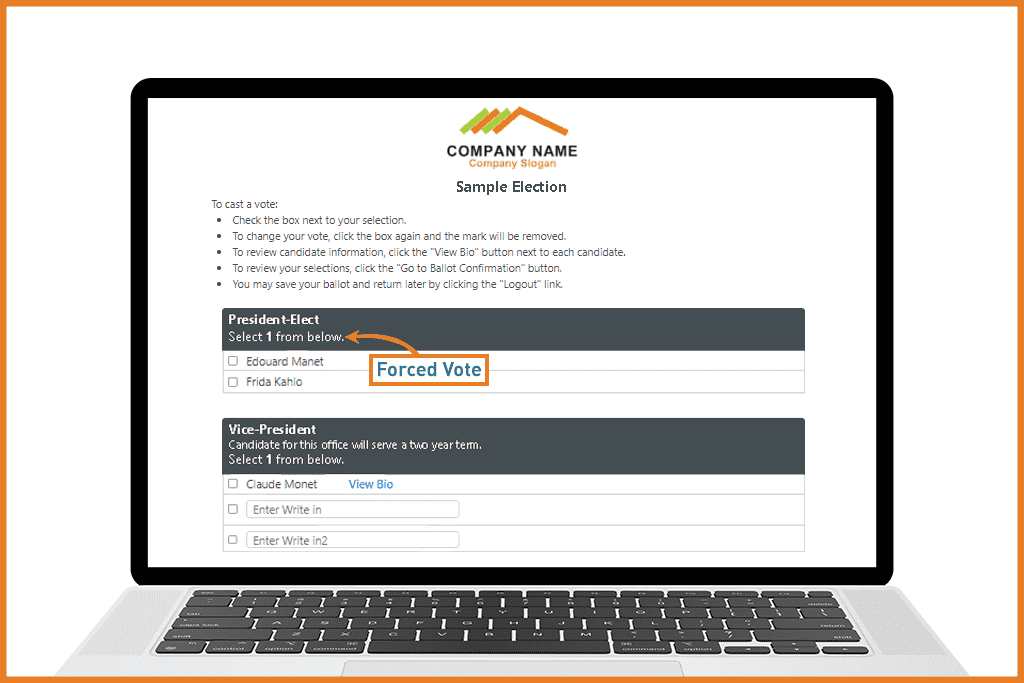 With a forced vote, members must make a selection to submit an online ballot. This means a member must choose a voting option, such as selecting a candidate, proxy choice, or bylaw amendment, before their ballot can be cast. Most forced votes happen because of bylaws or compliance requirements. This method ensures participation in key decisions but may require careful communication to maintain voter engagement.